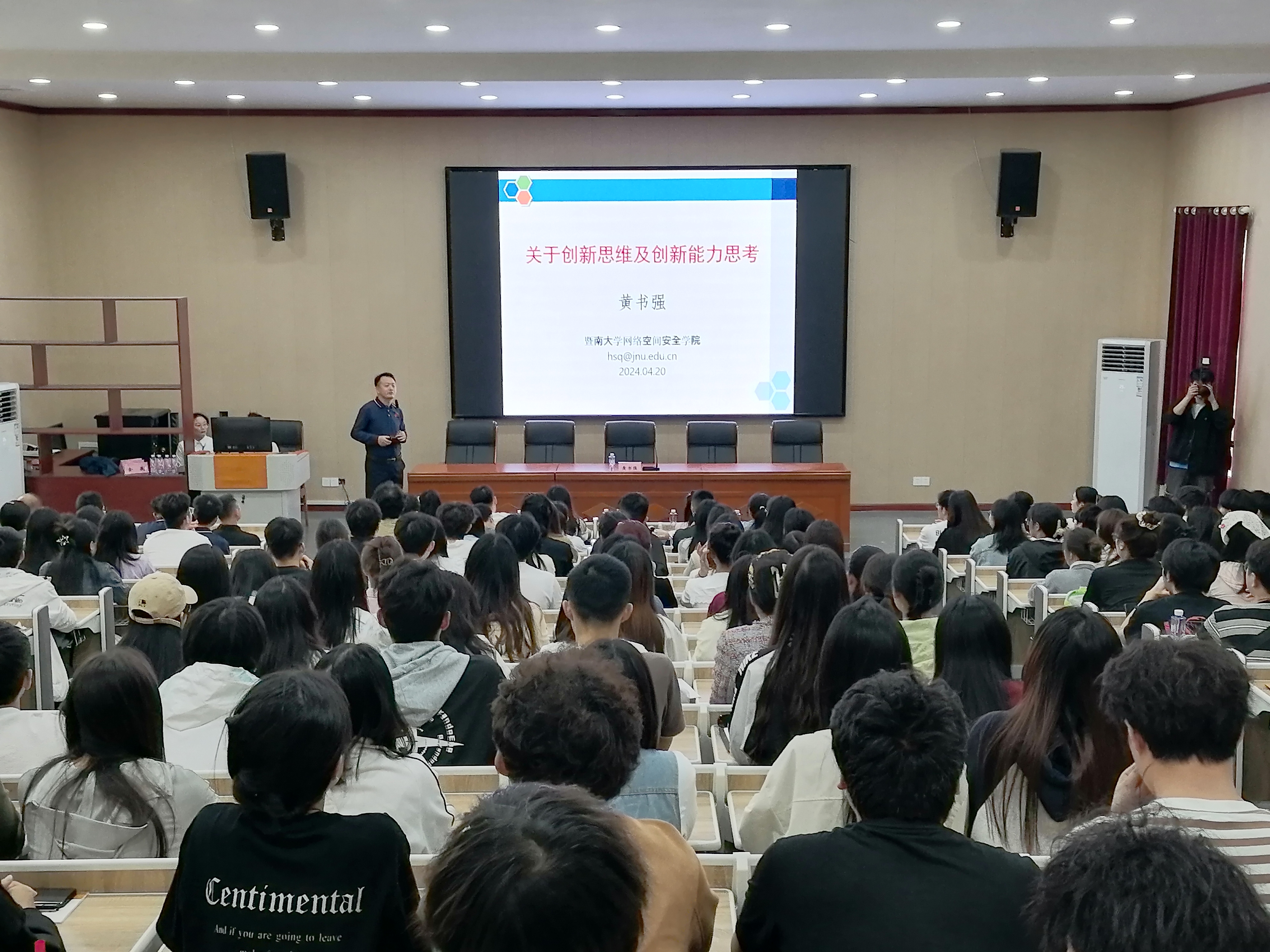 计算机科学与技术1996级校友、暨南大学网络安全学院教授、博士生导师黄书强学长以“关于创新思维及创新能力思考”为题,从曹冲称象的故事说起,围绕创新概念、创新思维三个层次、创新的思维方式,结合经典案例讲授了创新方法,鼓励在场的同学们用创新思维看问题,多学科和多个思想的交叉和融合学习,有意识培养自己创造思维,学会简单简洁地表达自己的思想,脚踏实地进行专业学习和训练。