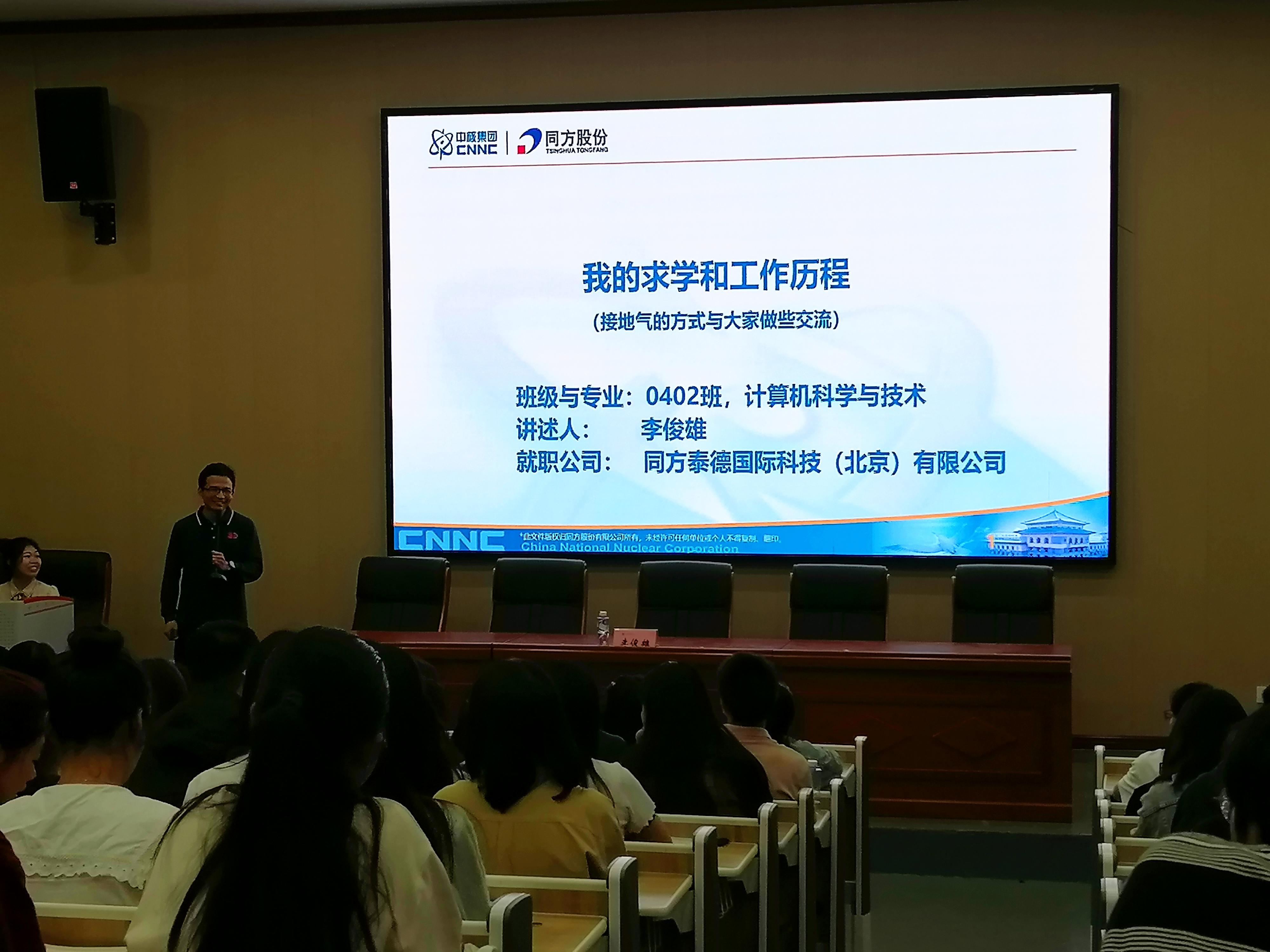 计算机科学与技术专业2004级校友、同方泰德国际科技(北京)有限公司李俊雄学长,按照时间跨度,从毕业至今,分享了他读书、考研、创业、找工作每一个阶段的心路历程。他说“现在的课程学习,都是有意义的。”鼓励大家学好英语、数学,不仅是一项技能,更能锻炼逻辑思维能力。不能封闭自己,多与同行交流,参与集体活动,积极寻求职业机会,保持良好的身心体魄,迎接挑战。