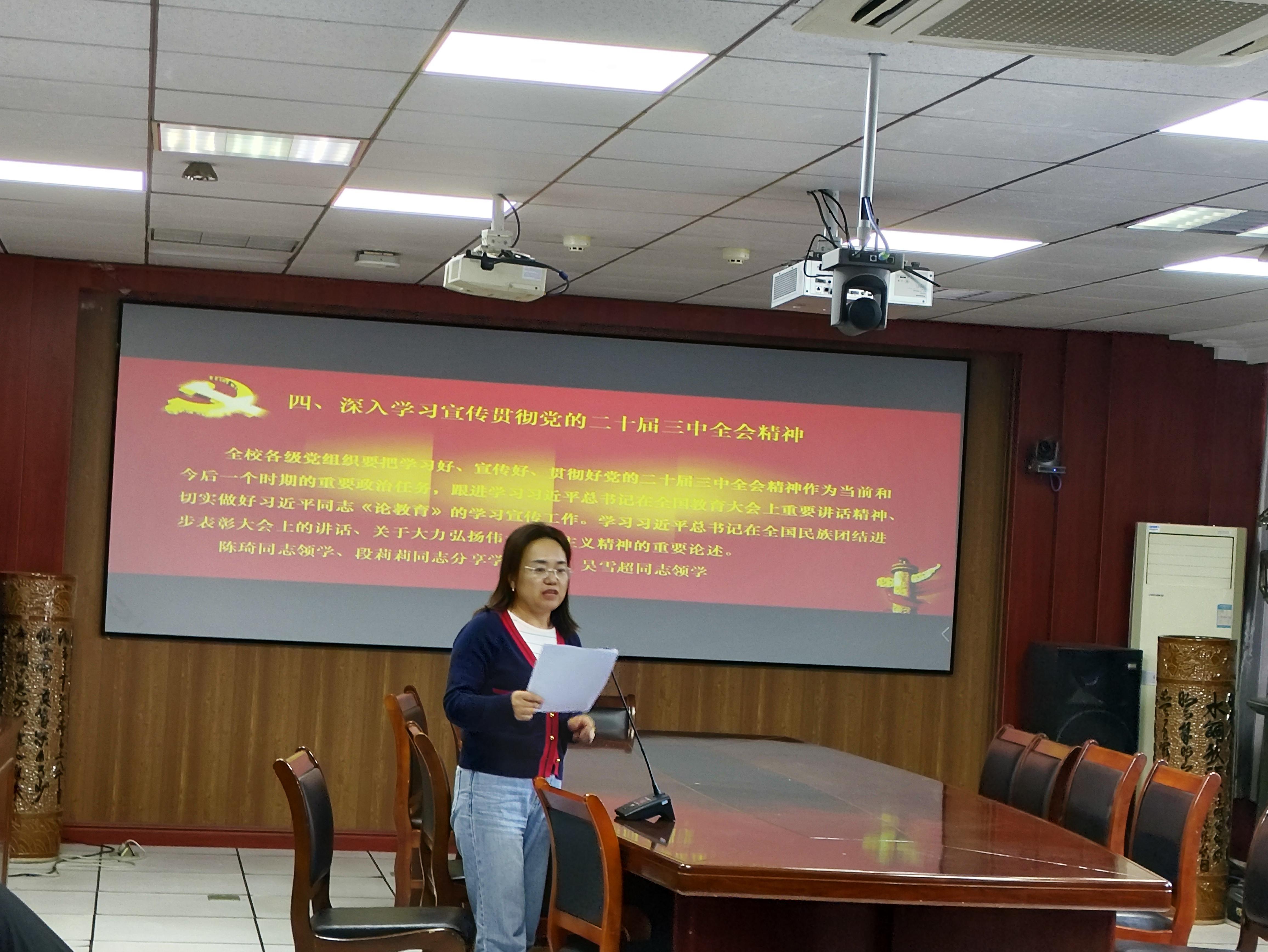 陈琦同志领学了党的二十届三中全会精神以及习近平同志《论教育》和全国教育大会精神,吴雪超同志领学了习近平总书记在全国民族团结进步表彰大会上的讲话、关于大力弘扬伟大爱国主义精神的重要论述以及全面深化改革精神,段莉莉同志针对本月学习内容分享心得体会。