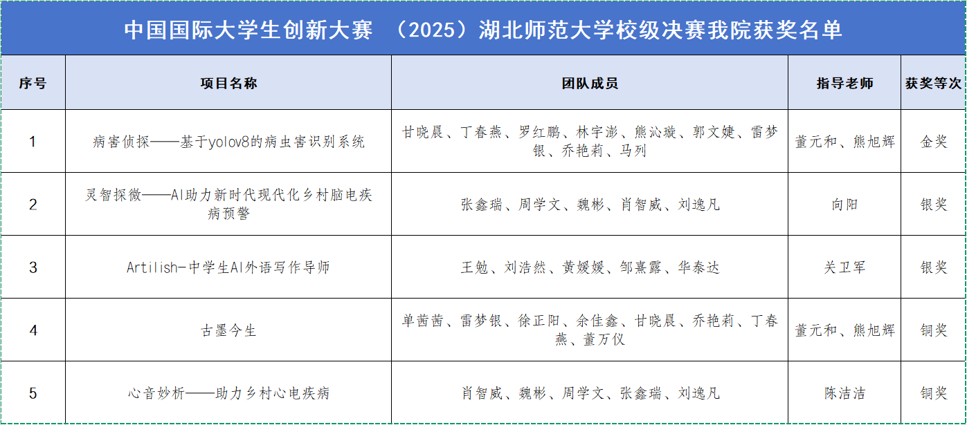 6月8日,中国国际大学生创新大赛(2025)校级决赛颁奖仪式在教育大楼报告厅举行,我院校级决赛参赛的5支团队均获奖,其中,金奖1项,银奖2项,铜奖2项。据悉,本次比赛全校参赛项目数为1822项,竞争激烈。